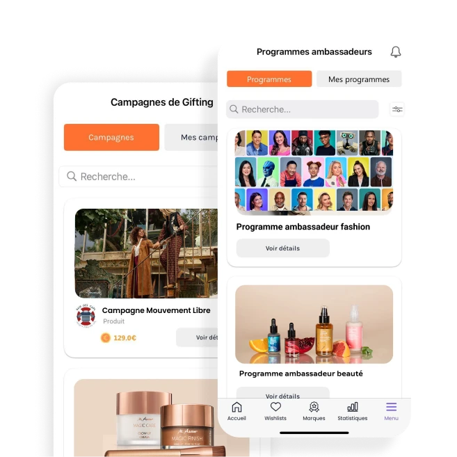 Diversifie tes revenus ! Postule aux campagnes de gifting et découvre nos "programmes ambassadeurs" pour des collaborations à long terme. Ton engagement et tes statistiques de performance font la différence auprès des marques. Génère des ventes via l’application et attire leur attention pour des collaborations rémunérées.